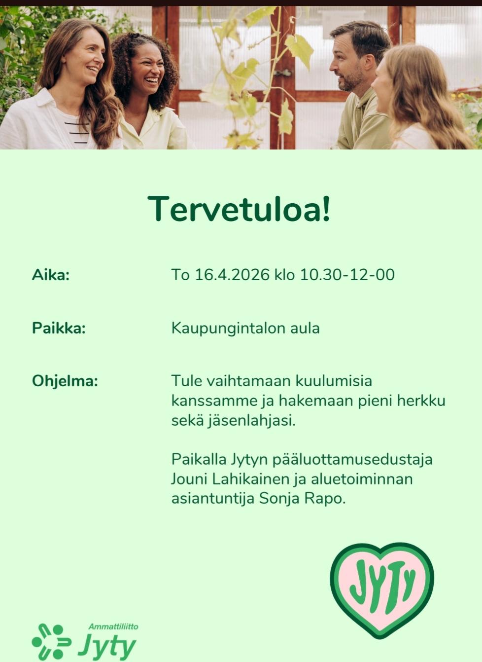 Jyty on ammattiliitto meille, jotka tartumme toimeen ja saamme työllämme arjen rullaamaan. Jytyläisiä toimii kunta-alalla, yksityisellä sektorilla, järjestöissä ja seurakunnissa. Jäsenistön suurimpia ammattialoja ovat sihteeri-, hallinto-, asiantuntija- ja ict-työ, nuoriso- ja järjestötyö, sosiaali- ja terveysala, kirjastoala sekä kasvatus ja koulutus. Ammattiliitto Jyty on tukenasi työelämässä ja vapaa-ajalla. Olemme STTK:n jäsenliitto.